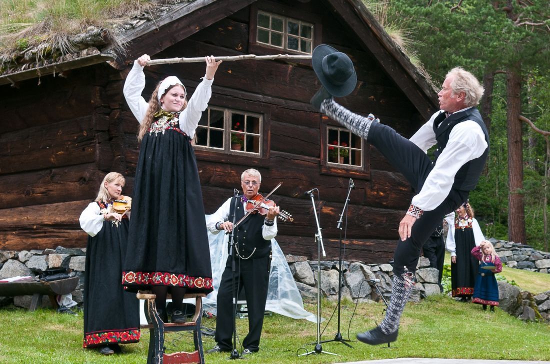 Kl. 12.45: Brudefølget kjem til gards på Hol bygdemuseum ved Hagafoss. Dei blir helsa med lurblåsing Anne Marie Kollhus. Fyritalsmennene orienterer på norsk og engelsk om brureskikkar og tradisjonar.